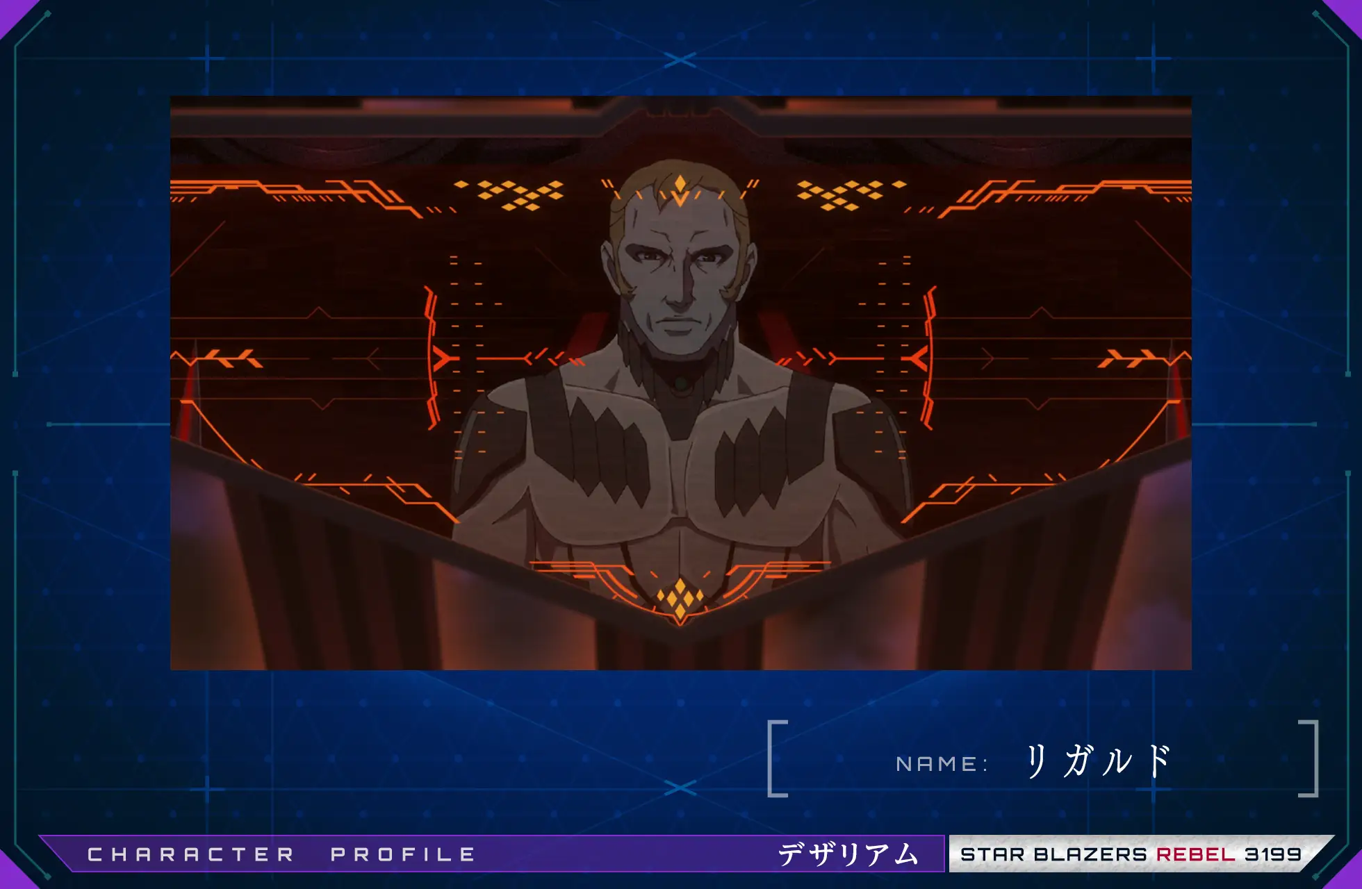 デザリアム軍内部にその名を轟かせる歴戦の強者。ガネル星雲内に設置された位相エネルギー補給基地ディガブラスの指揮官を務める。二万人の将兵を束ね、地球圏に展開する部隊へのエネルギー供給を司るリガルドの指揮ぶりはまさに威風堂々であり、援軍に訪れた〈グロテーズ〉艦長ランベルでさえも心酔させる。しかし、その正体は──。